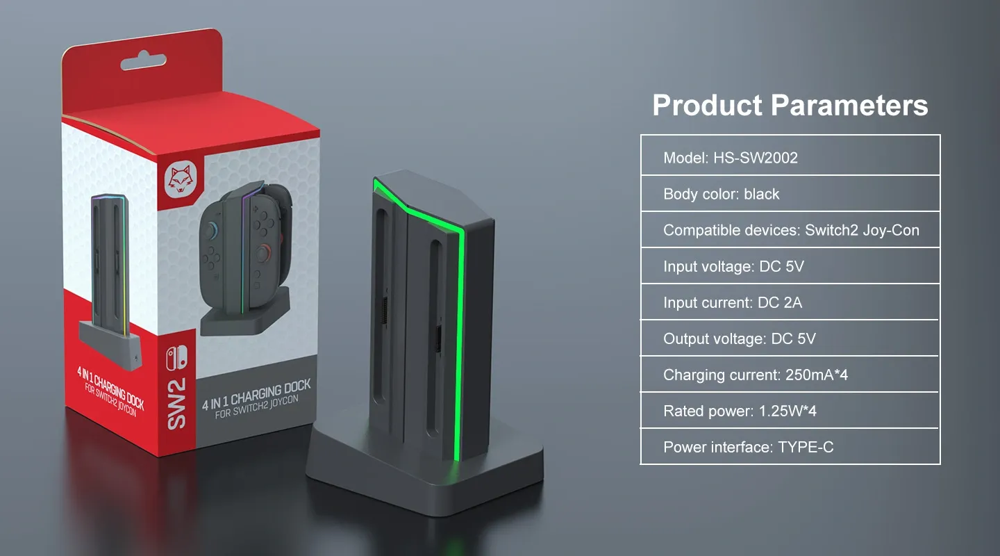 The is a compact and efficient charging dock tailored for Switch2 Joy-Con controllers. It supports simultaneous charging for four controllers with a consistent DC 5V output and 250mA per port. Designed in sleek black, it operates with a DC 5V / 2A input and delivers 1.25W × 4 rated power. Powered via Type-C, it ensures fast, stable, and safe charging for your gaming setup.