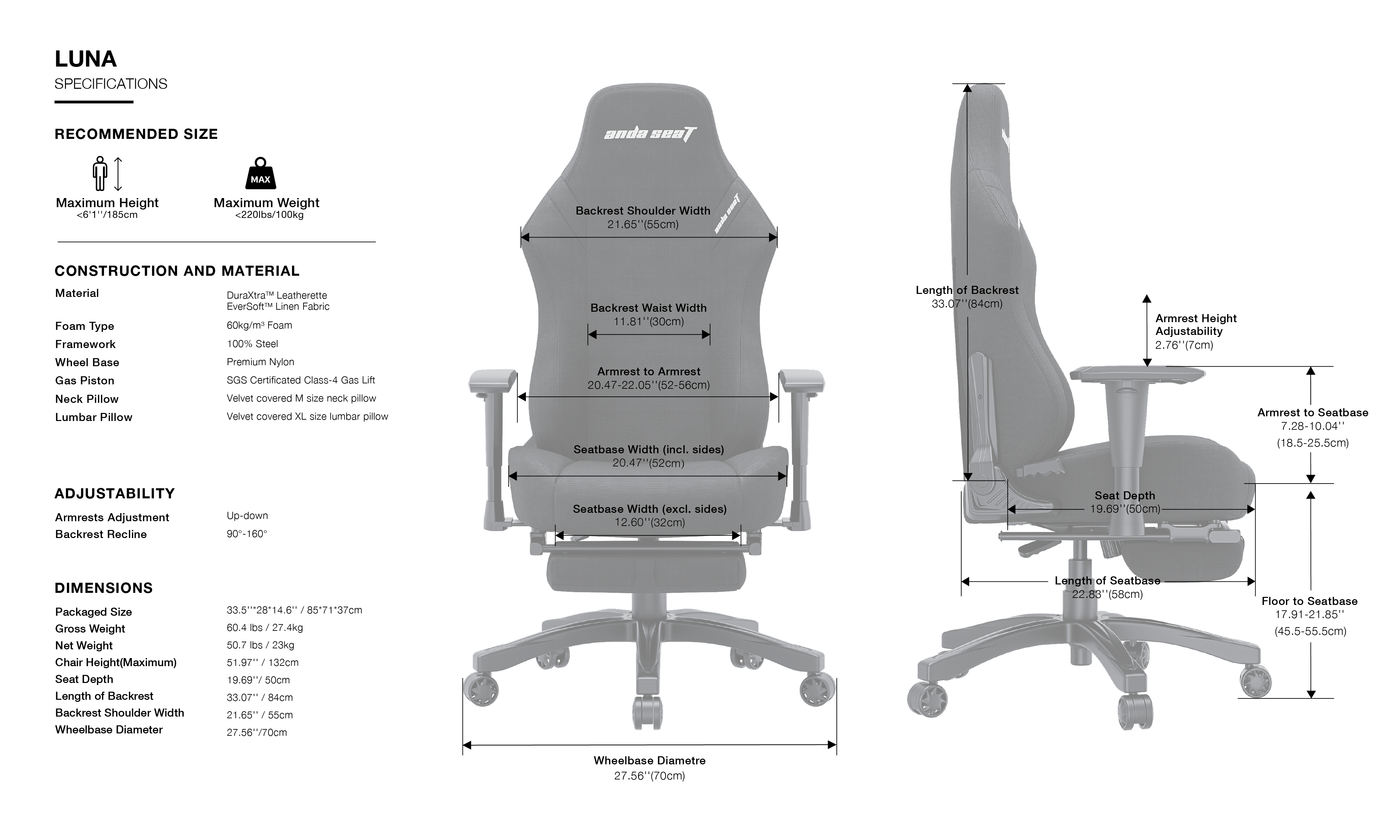 The Anda Seat Luna Pro Gaming Chair Size L is your ticket to premium comfort that will make every gaming session or workday a real pleasure. Designed for gamers and professionals, this chair combines ergonomics, style and durability. With breathable linen fabric, a sturdy steel frame, Memory Foam and a footrest, it is ideal for users up to 180 cm tall and weighing up to 100 kg. The black color and modern design will make it the star of any gaming setup or office.