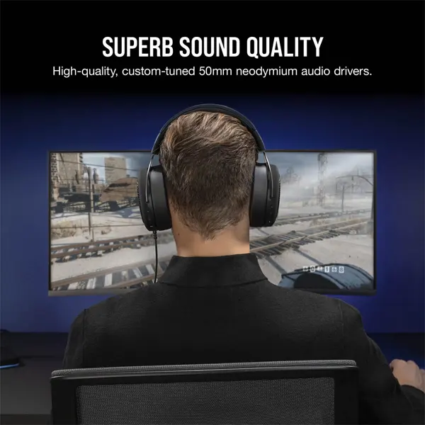 The CORSAIR HS60 HAPTIC Gaming Headset delivers haptic bass that you can feel, with comfortable memory foam ear pads and custom-tuned 50mm neodymium audio drivers for quality audio.