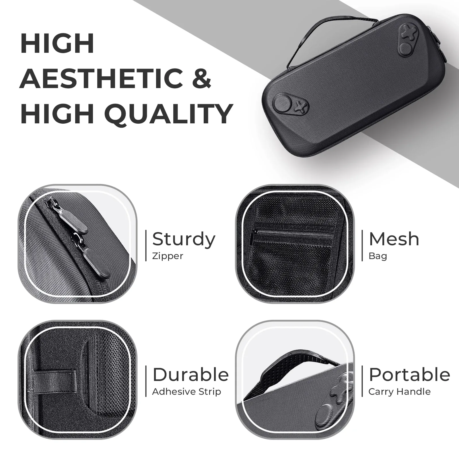 • Universal Fit – Perfectly fits ROG Ally & Xbox Ally handheld consoles • Strong EVA Protection – Guards against drops, impacts, and scratches • Compact & Travel-Ready – Lightweight with easy carry handle • Secure Interior – Soft lining and elastic strap keep device stable • Extra Storage – Zipper mesh pocket for cables & accessories • Comfort Grip Handle – Anti-slip, ergonomic design • Sleek Gaming Style – Minimalist black look with embossed details