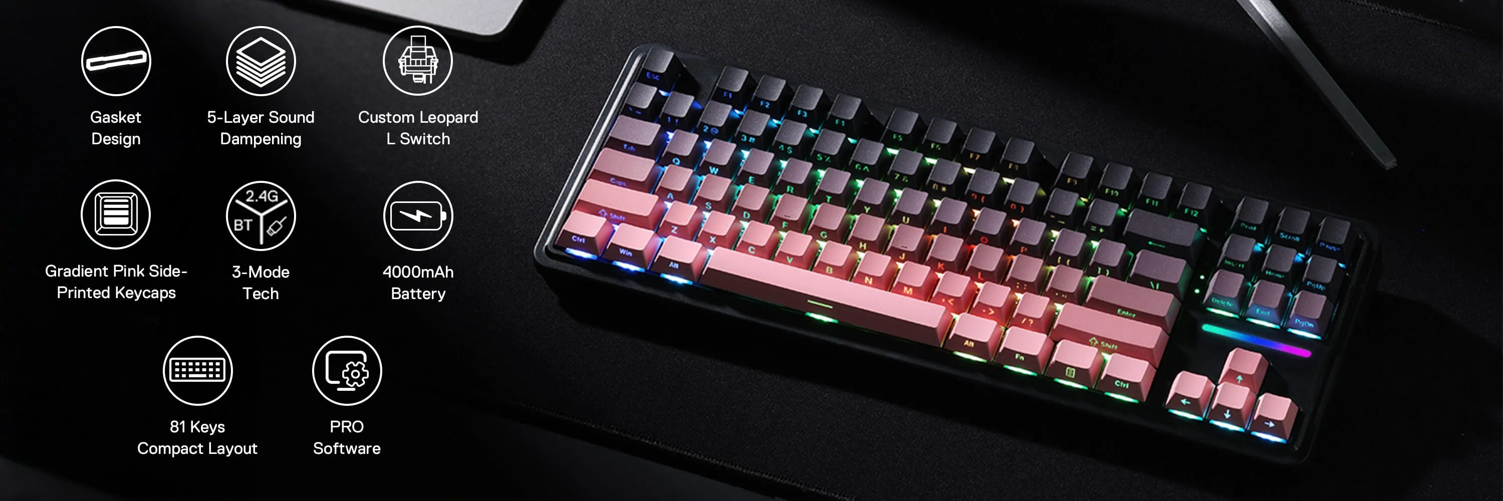 Experience gaming elegance with south-facing LEDs, perfectly lit up the keyboard for intense gameplay. The gradient black & pink PBT keycaps look shiny too even without backlight.