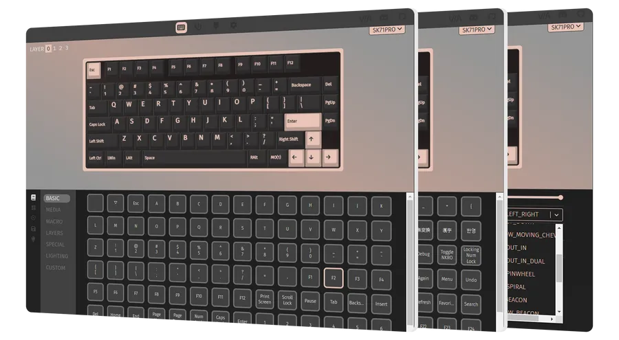 The SK71 Pro is designed to meet the needs of every user, with versatile layout support for ANSI, ISO, and split spacebar configurations. This keyboard adapts to your preferences, providing a personalized typing experience.