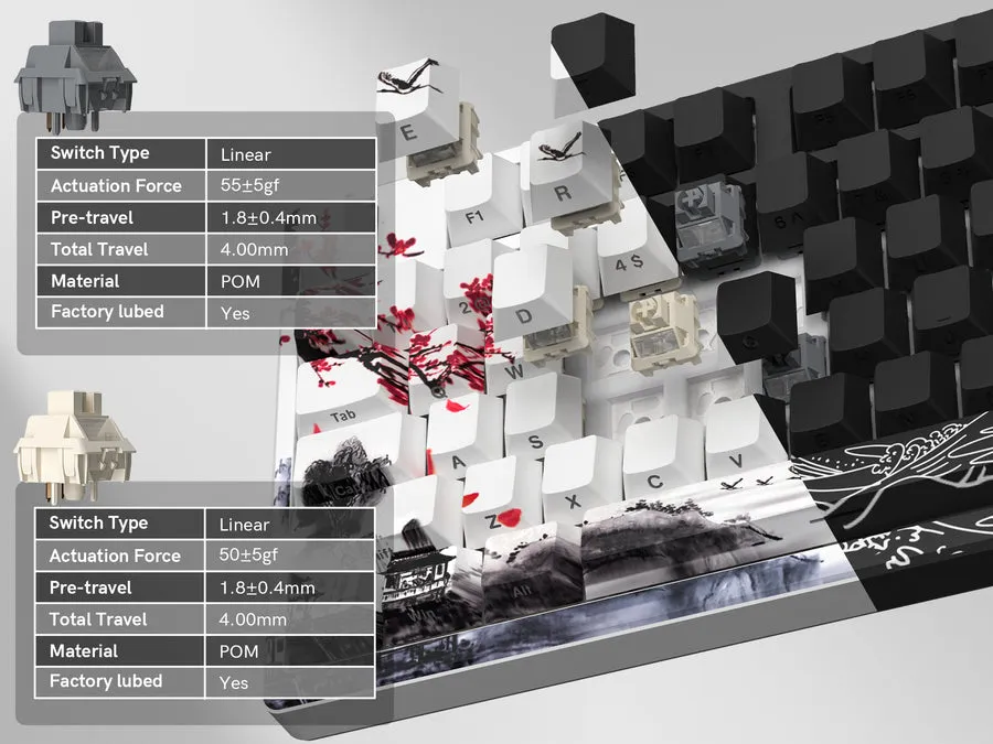 The full POM material ensures that the switches are not easily worn out after prolonged use. The switches are pre-lubed for better typing feel and sound. Additionally, the LED diffuser design allows the RGB lighting to be more evenly distributed, thereby enhancing the keyboard's lighting effects