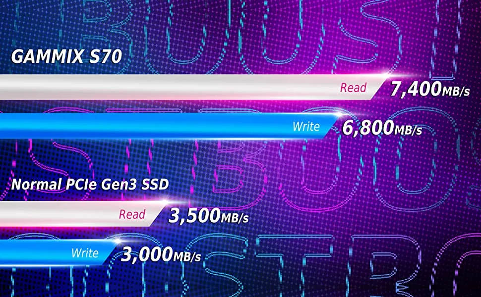 With the latest PCIe Gen4 interface, the GAMMIX S70 will help you dominate the competition with sequential read/write performance of up to 7400/6400/MB per second. That's up to two times faster than PCIe 3.0 SSDs! For ease of use, it's backward compatible with PCIe 3.0.